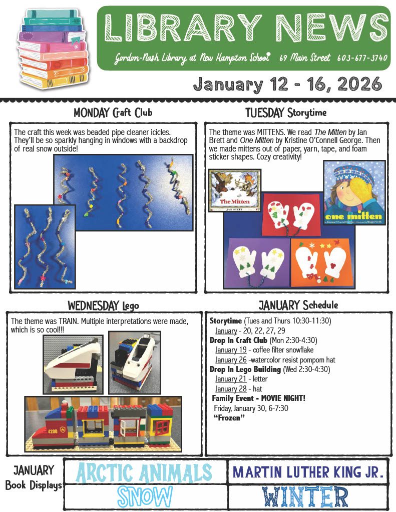December Newsletter/Events Posted on December 9, 2024December 9, 2024 By jblackeynhs Share this content: Share this: Click to share on Facebook (Opens in new window) Facebook Like this:Like Loading... Children's Programs Tags:Gordon Nash Library Staff, Gordon-Nash library, New Hampshire, New Hampton